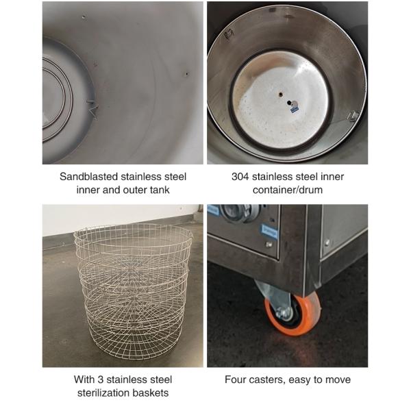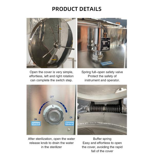 The electric heating pressure steam sterilizer has a steel protection mechanism with micro switch and mechanical interlocking. It is made of thickened 304 stainless steel and equipped with a dual-scale 2-stage pressure gauge, overpressure protection safety valve and low water level power-off protection.